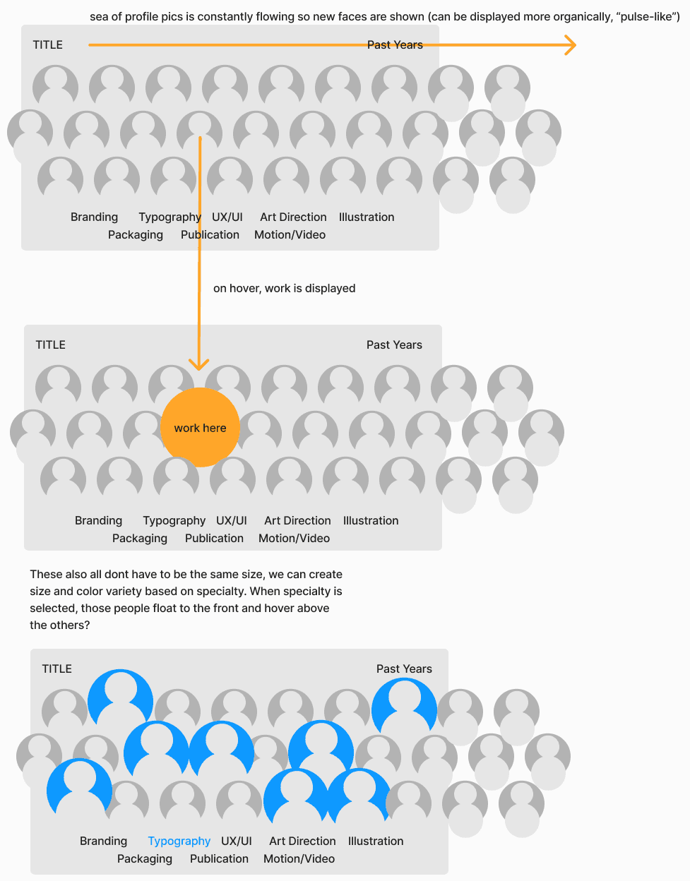 Creating a website to showcase our graphic design class required exceptional attention to detail—the platform needed to both promote our exhibition and serve as a portfolio launchpad for forty-seven unique designers. We aimed to balance sophisticated aesthetics with functionality, creating a digital experience that complemented our physical exhibition while giving each designer the chance to meet their next employer.