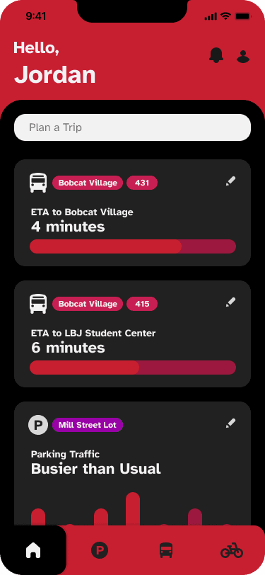 The San Marcos transportation system is fragmented across multiple services and apps, creating inefficiencies for users who must navigate unpredictable traffic, unsafe pedestrian conditions, and disconnected transit options. Students and residents struggle with poor mobility across campus and the city, causing frustration, tardiness, and safety concerns.
